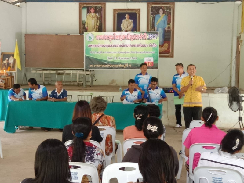 วันที่ 25 สิงหาคม 2568 นายศิวกร ศรีภักดี สหกรณ์จังหวัดนครศรีธรรมราช มอบหมายให้นายเติมศักดิ์ เสียมไหม ผู้อำนวยการนิคมสหกรณ์ทุ่งสง พร้อมด้วยนางสุดารัตน์ เชื้อช่างเขียน นักวิชาการสหกรณ์ปฏิบัติการ และนางสาวนุชนารถ เกิดสมจิตต์ นักวิชาการสหกรณ์ สังกัดนิคมสหกรณ์ทุ่งสง สำนักงานสหกรณ์จังหวัดนครศรีธรรมราช เข้าร่วมประชุมใหญ่สามัญประจำปีสำหรับปีบัญชีสิ้นสุด 31 มีนาคม 2568 ของสหกรณ์กองทุนสวนยางนิคมเกษตรพัฒนา จำกัด สมาชิกเข้าประชุม 97 คน จากสาชิกทั้งหมด 97 คน ที่ประชุมใหญ่ได้ดำเนินการไปตามวาระการประชุม รับทราบผลการดำเนินงานประจำปี 2568 พิจารณาอนุมัติแผนงานและประมาณการรายรับ-รายจ่ายประจำปี 2569 พิจารณาเลือกตั้งคณะกรรมการสหกรณ์ พิจารณาแก้ไขเพิ่มเติมข้อบังคับสหกรณ์ให้เป็นไปตามกฎกระทรวงและสอดคล้องกับการดำเนินงานของสหกรณ์ พิจารณาอนุมัติงบการเงินประจำปีสิ้นสุดวันที่ 31 มีนาคม 2568 สหกรณ์มีกำไรสุทธิ จำนวน 1,132,906.69 บาท ที่ประชุมใหญ่จัดสรรกำไรสุทธิเป็นไปตามพระราชบัญญัติสหกรณ์ พ.ศ.2542 และที่แก้ไขเพิ่มเติม และตามข้อบังคับของสหกรณ์ เป็นทุนสำรองร้อยละ 10.19 ค่าบำรุงสันนิบาตสหกรณ์ ร้อยละ 1 เงินปันผลร้อยละ 3 ของทุนเรือนหุ้น เงินเฉลี่ยคืนตามน้ำหนักยาง กก.ละ 3.10 บาท และจัดสรรเป็นทุนอื่น ๆ สหกรณ์มีการแจกข้าวสาร 5 กก. ให้กับสมาชิกที่เข้าร่วมประชุมใหญ่สามัญประจำปี คนละ 1 ถุง