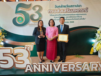 เมื่อวันที่ 30 กันยายน 2568 นายวิศิษฐ์ ศรีสุวรรณ์ อธิบดีกรมส่งเสริมสหกรณ์ เป็นประธานกล่าวเปิดโครงการจัดงานเนื่องในโอกาสวันคล้ายวันสถาปนา กรมส่งเสริมสหกรณ์ ครบรอบ 53 ปี ซึ่งจัดระหว่างวันที่ 30 กันยายน - 1 ตุลาคม 2568 ณ โรงแรมปรินซ์พาเลซ ถนนกรุงเกษม แขวงคลองมหานาค เขตป้อมปราบศัตรูพ่าย กรุงเทพมหานคร ในโอกาสนี้ประธานฯ ได้มอบรางวัลประกาศเกียรติคุณผู้ทำคุณประโยชน์ให้กับกรมส่งเสริมสหกรณ์, รางวัลหน่วยงานที่มีผลการปฏิบัติงานและการใช้จ่ายงบประมาณระดับคุณภาพดีเด่น และรางวัลนักส่งเสริมและสนับสนุนสหกรณ์ดีเด่น ประจำปี 2568 ในการนี้ นายศิวกร ศรีภักดี สหกรณ์จังหวัดนครศรีธรรมราช มอบหมายให้ นายอดุล วรรณาการ ผู้อำนวยการกลุ่มส่งเสริมสหกรณ์ 6 พร้อมด้วย นางสาวนันท์นภัส แทนโป นักวิชาการสหกรณ์ชำนาญการ เข้าร่วมโครงการฯ ในส่วนของสำนักงานสหกรณ์จังหวัดนครศรีธรรมราช ได้รับรางวัล ดังนี้